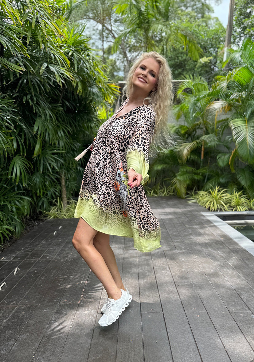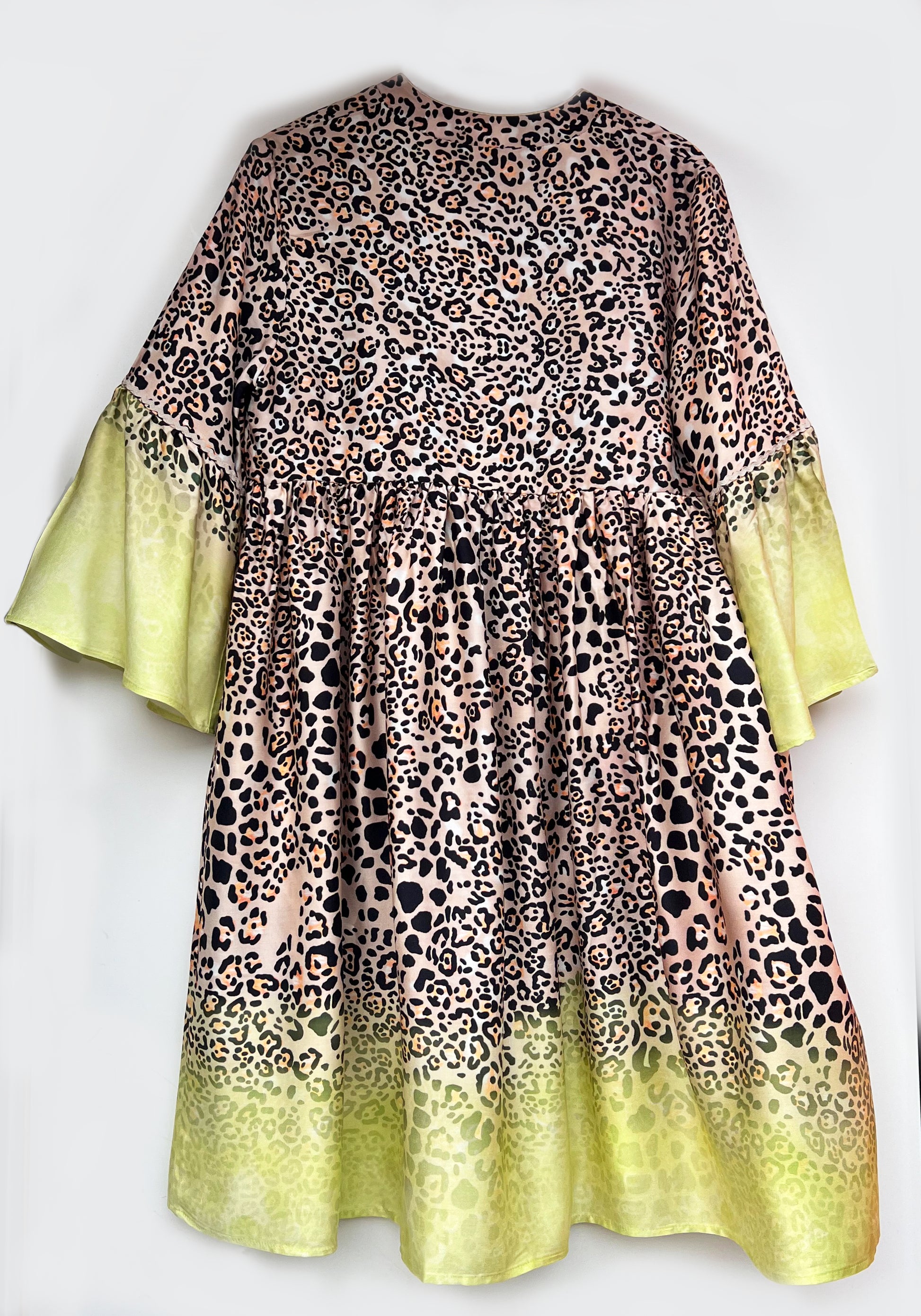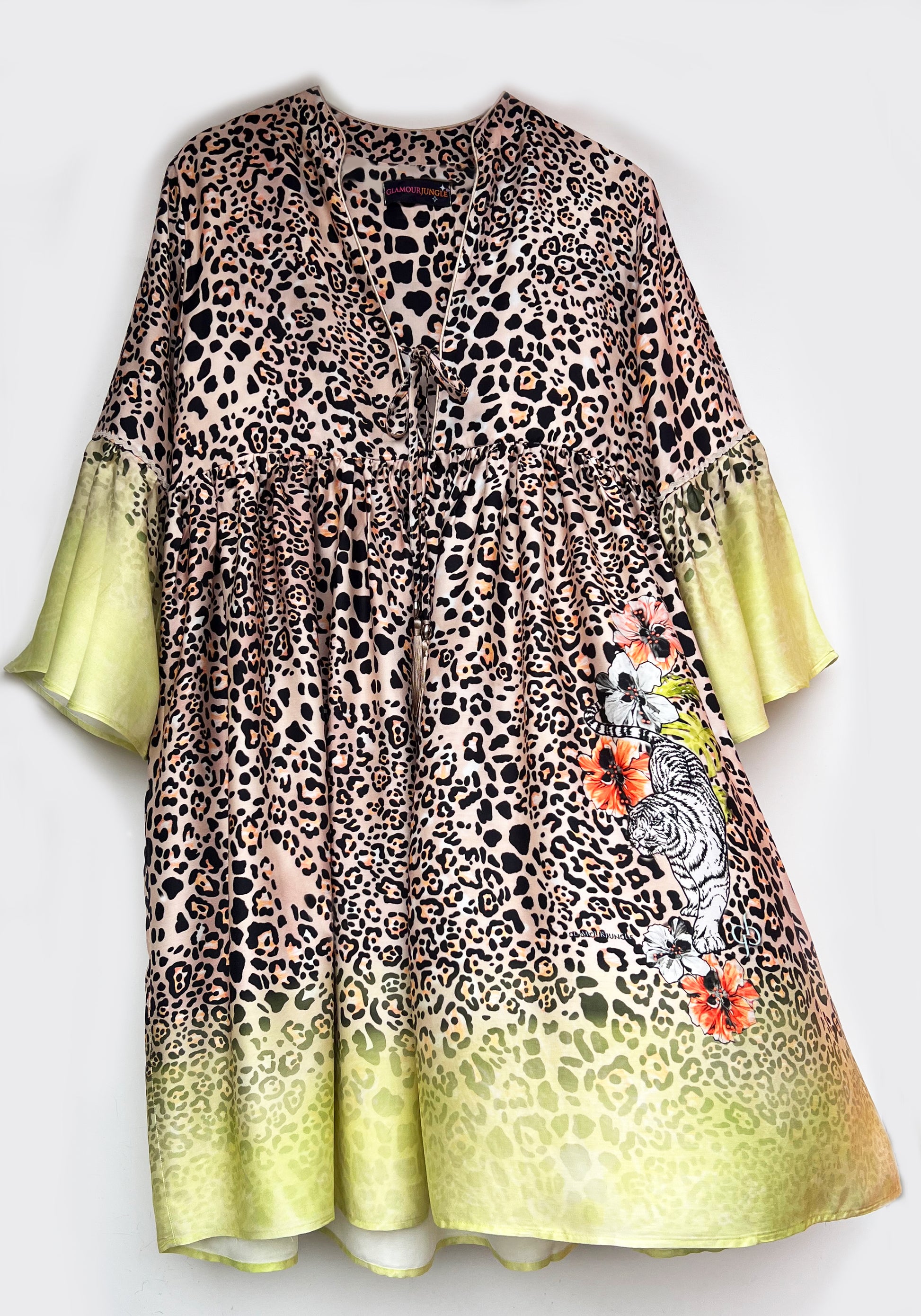 Das Kleid mit unserem ikonischen Print „Leo Love“ ist eine kreative Hommage an den Animalprint Klassiker. Mit Designelementen wie dem zarten grünen Degradee an den Säumen, unserem Jumping Tiger Artwork und coolen Kontrast Blumen hat es einen richtigen handmade Look.