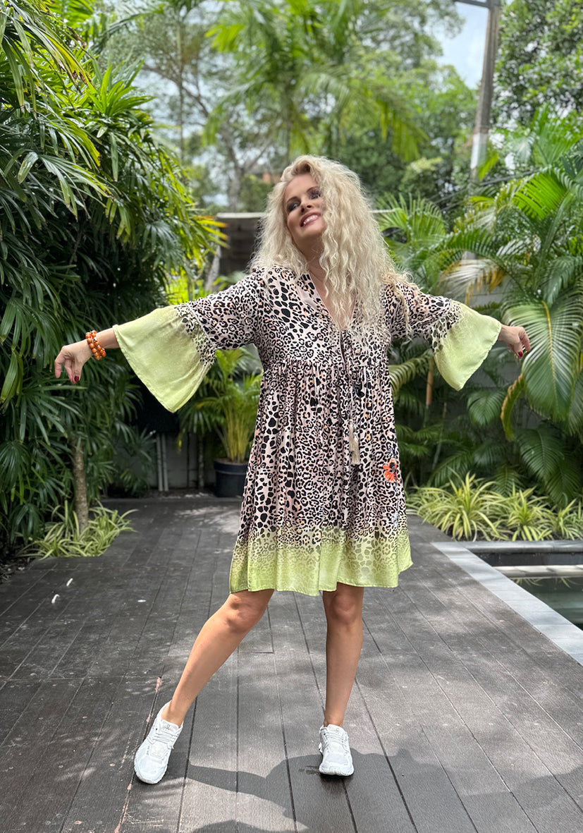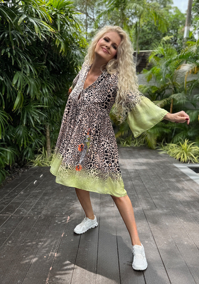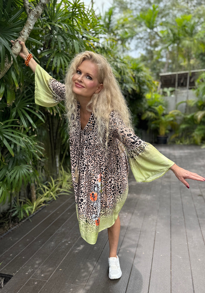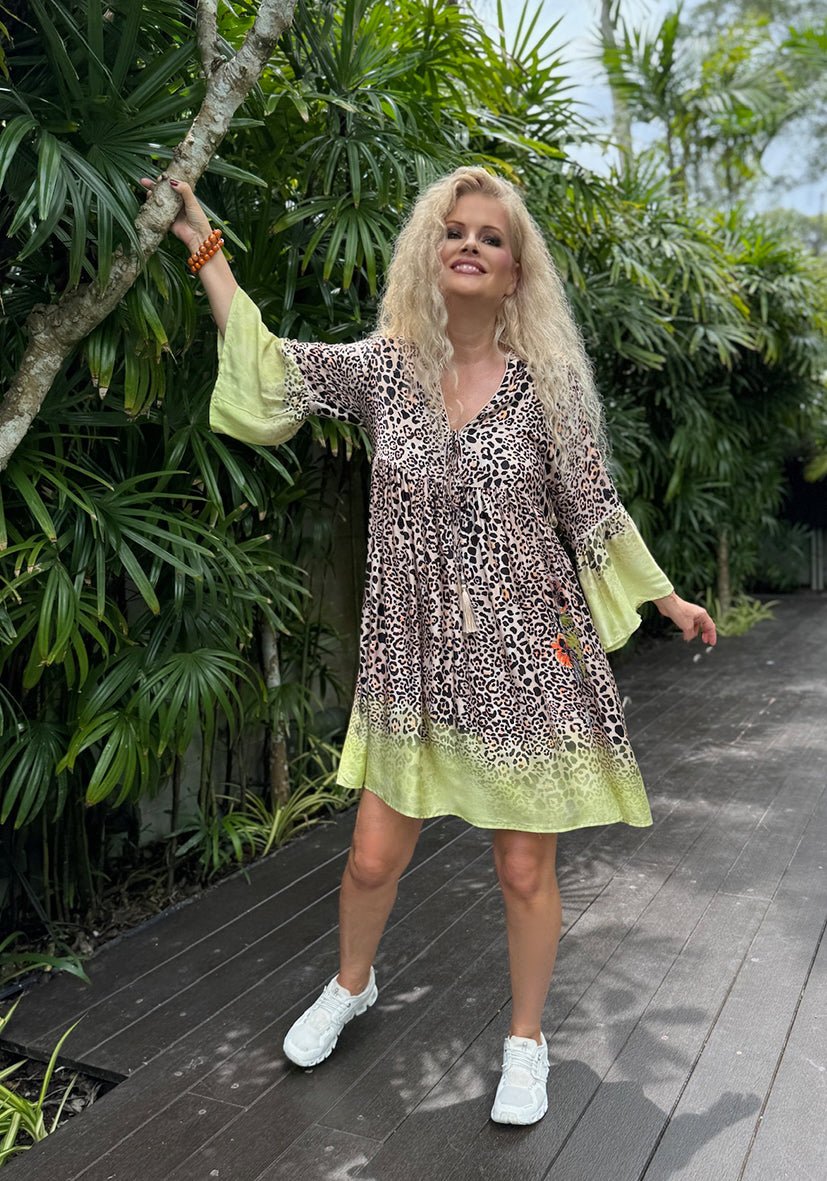 Das Kleid mit unserem ikonischen Print „Leo Love“ ist eine kreative Hommage an den Animalprint Klassiker. Mit Designelementen wie dem zarten grünen Degradee an den Säumen, unserem Jumping Tiger Artwork und coolen Kontrast Blumen hat es einen richtigen handmade Look.