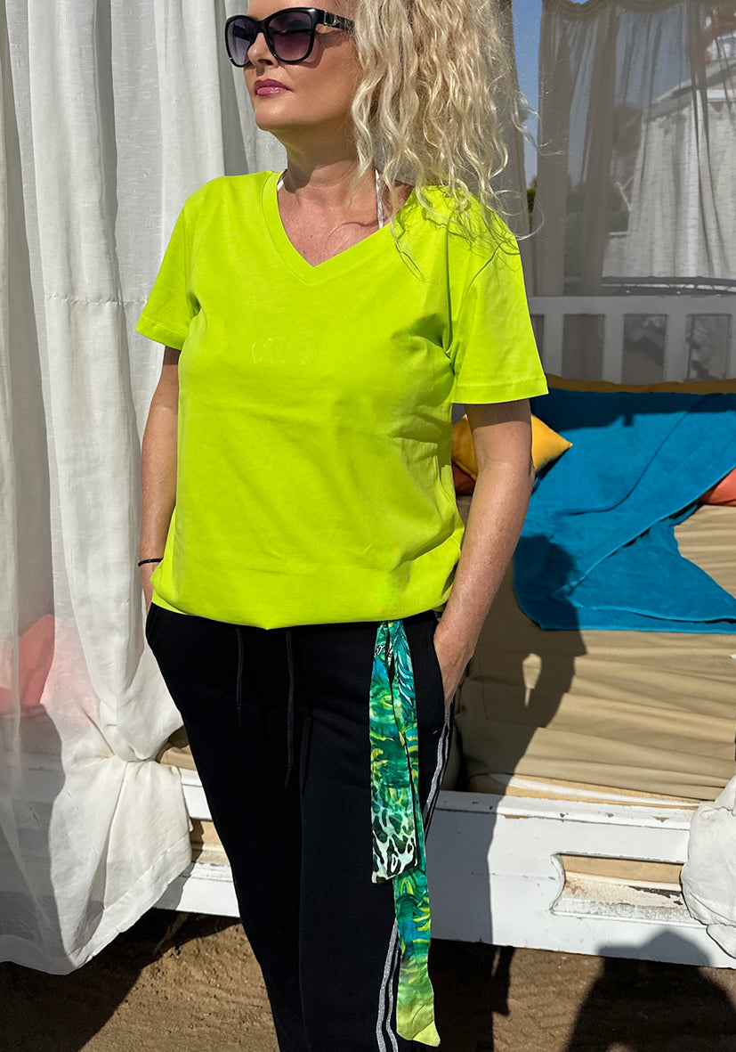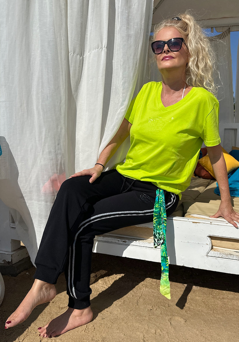 Das Motiv dieses Twilly´s ist unser „Jungle Glam“ Print in schillernden Grün Tönen und es passt hervorragend zu unserem Sweatshirt in Lime Green. Oder zu unserer Sweatpant mit unserem lässigen T-Shirt in Lime Green.